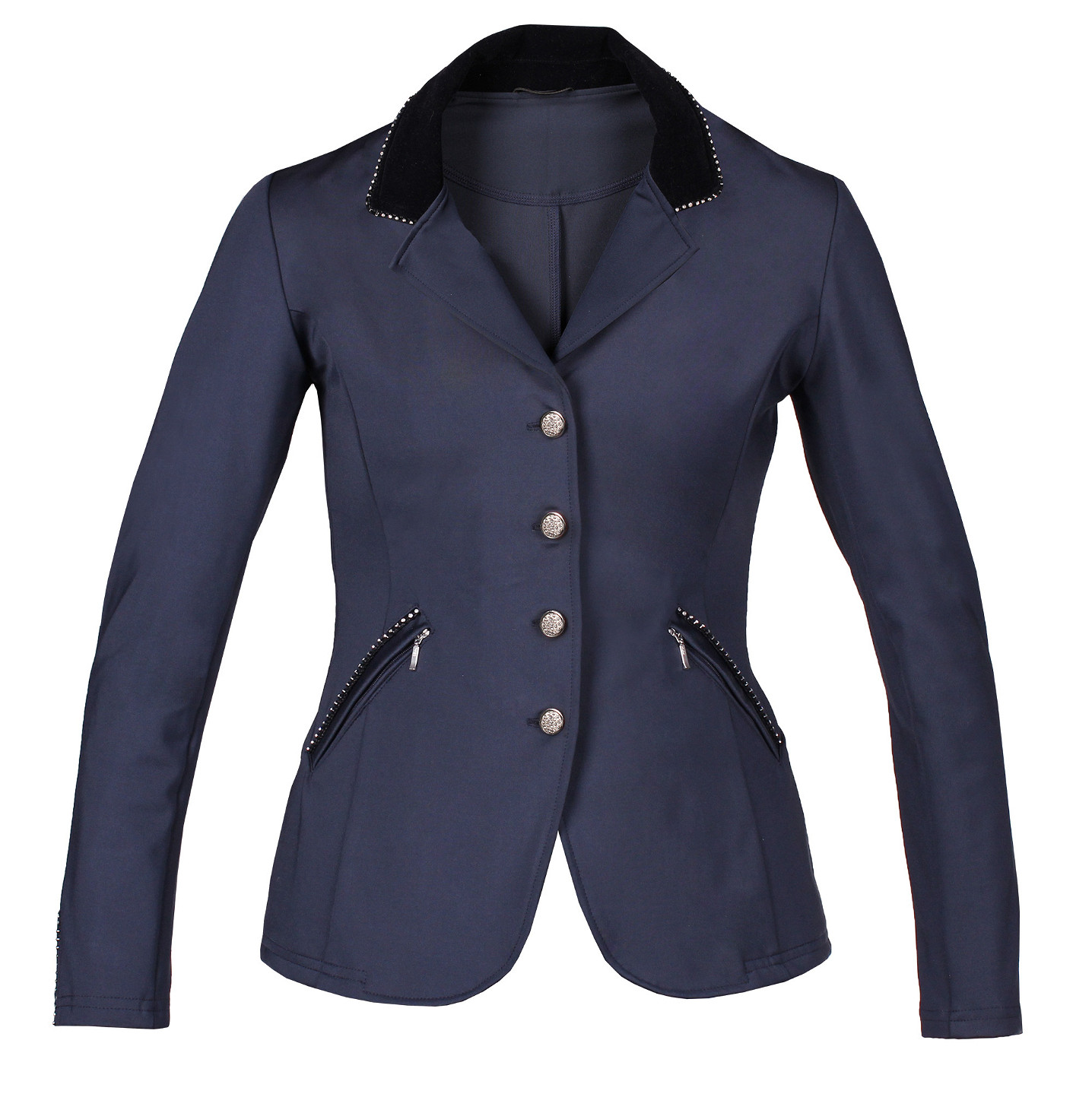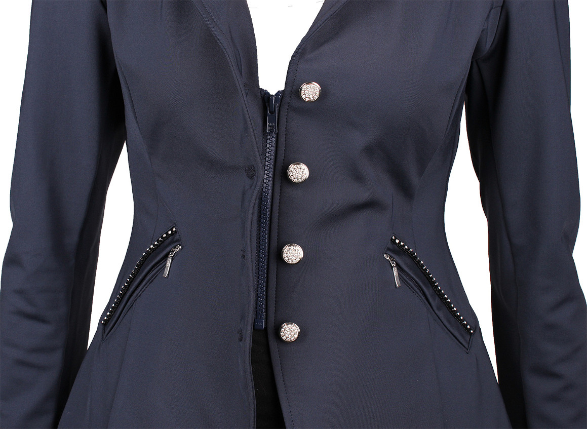 | Dames wedstrijdjasje gemaakt van waterafstotende softshell stof. Het jasje is vormgegeven met een fluwelen kraag en kristallen bies langs de kraag en zakken. Productspecificaties: - Fluwelen kraag met kristallen bies - Kristallen bies op zakken met ritssluiting - Ristsluiting aan de voorkant voor een perfecte pasvorm - Flap met kristallen over de rits voor een perfecte look Materiaal: 91% nylon, 9% elastaan Maattabel |
