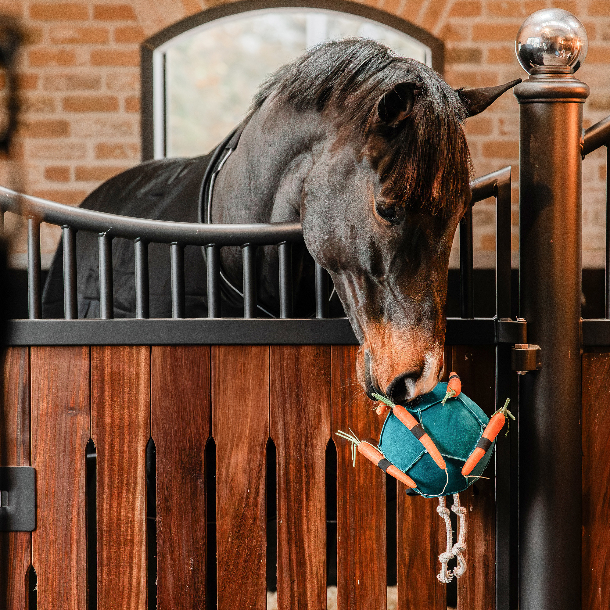 | Paardenspeelgoed in de vorm van een bal met lusjes voor wortels, gemaakt van suede leer. Kan gebruikt worden om verveling tegen te gaan en stress te verminderen en kan in de stal, paddock, wei of in de vrachtwagen tijdens transport worden opgehangen. Productspecificaties: - Speelgoed voor paarden - Balvorm met lusjes voor wortels - Geschikt voor stal, weide, paddock en vrachtwagen - Hoogte: 35 cm Materiaal: Suede leer buitenzijde, polyfiber binnenzijde |
