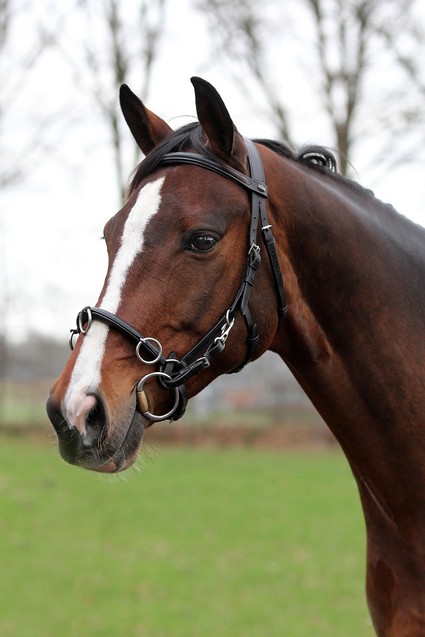 | Leren kaptoom. Productspecificaties: - Licht gewicht - Zweedse of doorhaalneusriem - 3 ringen op de neusriem voor het bevestigen van de longeerlijn en/of bijzetteugels - In de neusriem zit een dunne, flexibele ketting - Afneembare bitbevestigingen om met of zonder bit te gebruiken - De omtrek aan de binnenkant van de neusriem gemeten maximaal 62 cm en minimaal 50 cm |